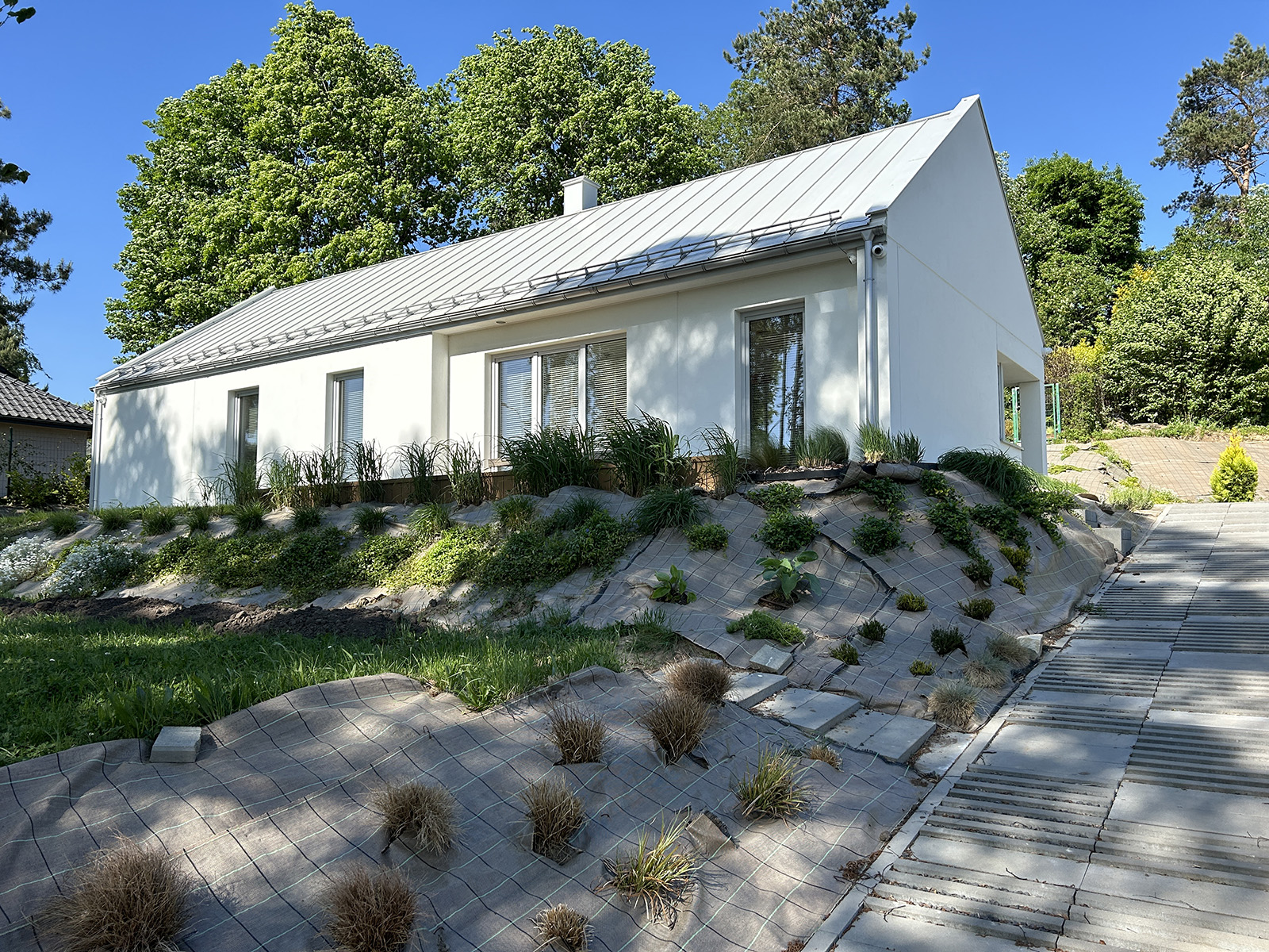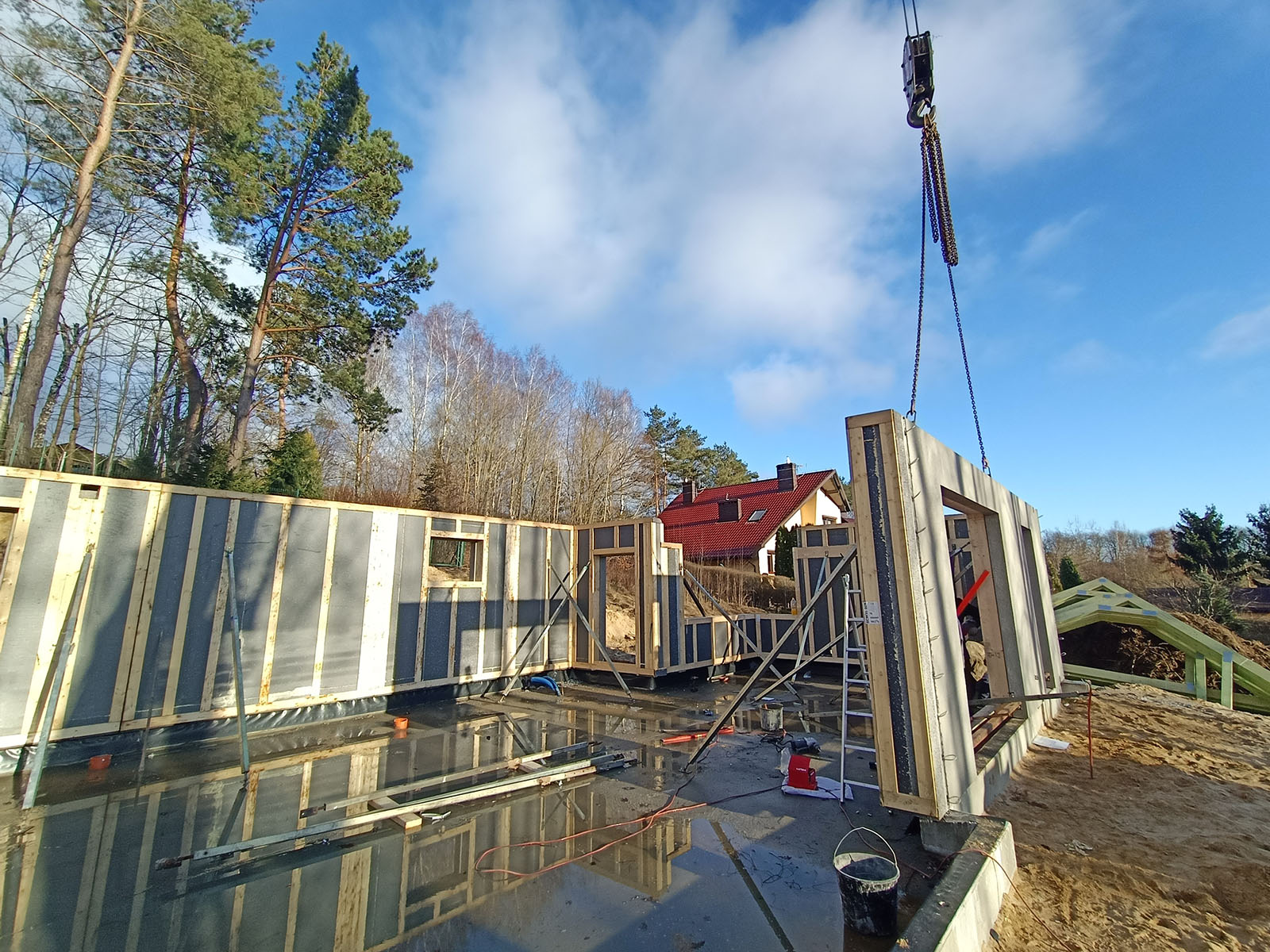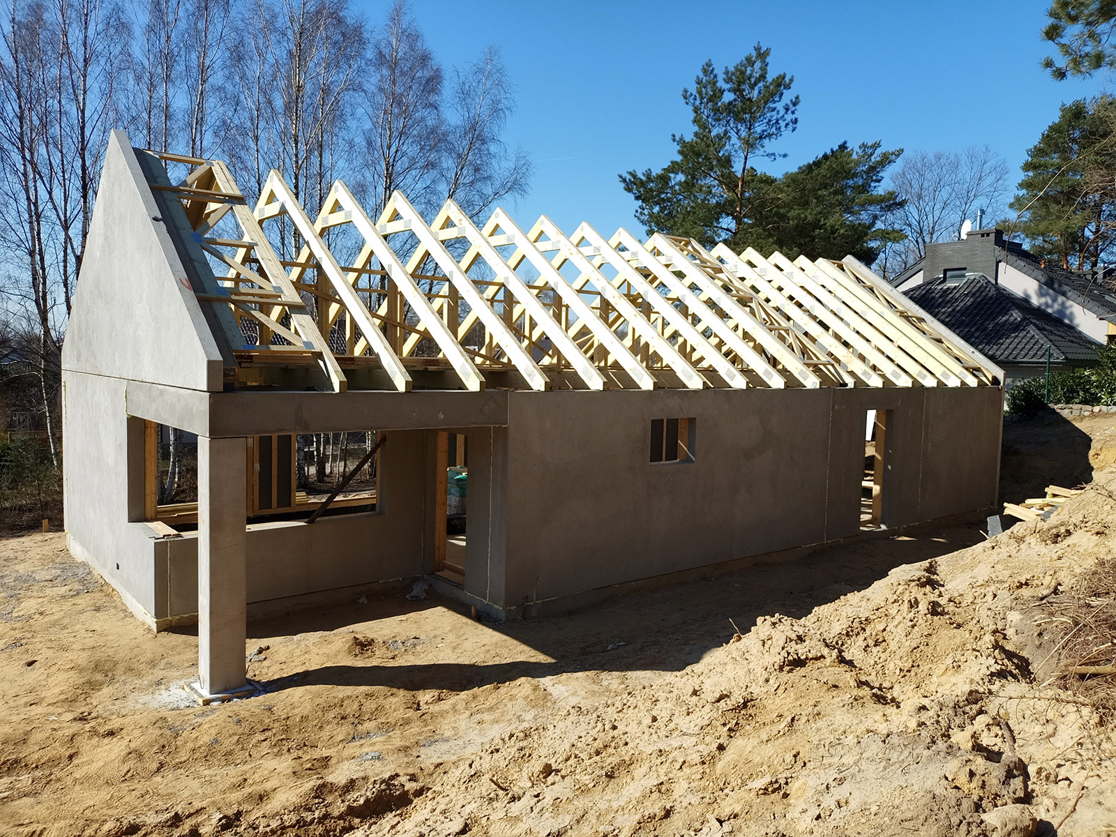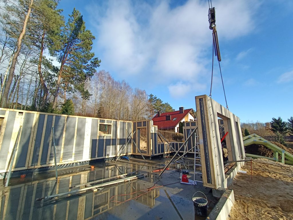 Krótki opis: Ława fundamentowa żelbetowa, ściana fundamentowa prefabrykowana, ściany nośne żelbetowe prefabrykowane, wiązary dachowe C24, dach bezokapowy kryty blachą.